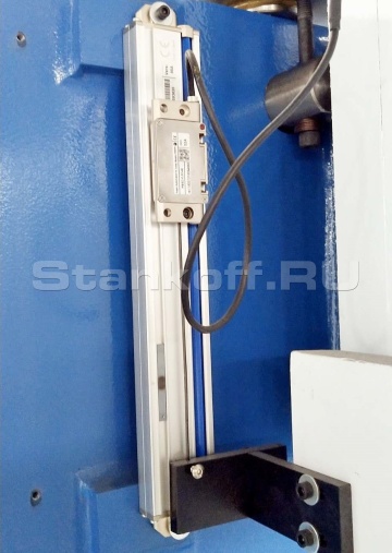 По бокам траверсы установлены оптические линейки, передающие информацию о положении траверсы стойке ЧПУ с точностью 0,01мм, тем самым осуществляется синхронизация между гидроцилиндрами Y1 и Y2.Выносная педаль управления, переключатель с кнопками управления Z1, Z2