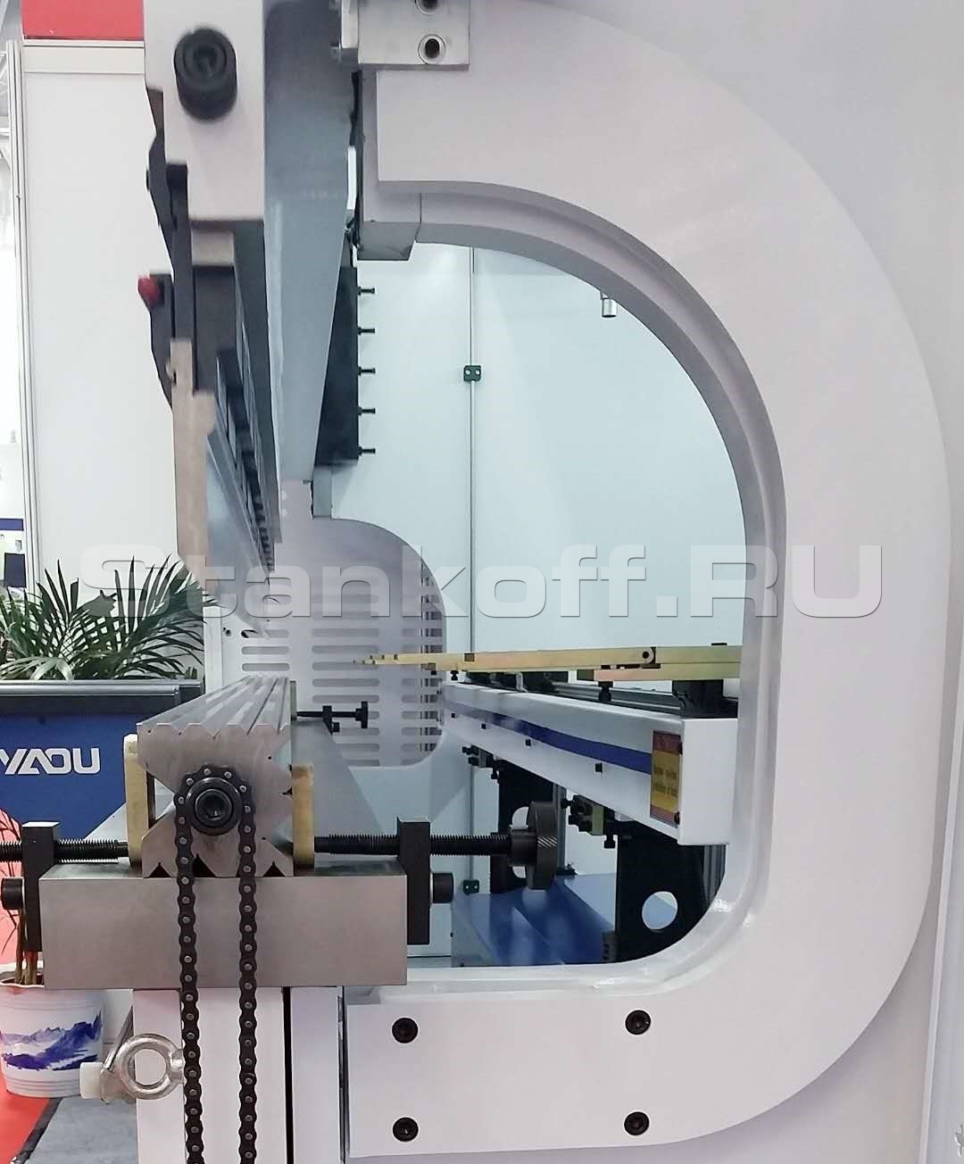 По бокам траверсы установлены оптические линейки, передающие информацию о положении траверсы стойке ЧПУ с точностью 0,01мм, тем самым осуществляется синхронизация между гидроцилиндрами Y1 и Y2.Выносная педаль управления, переключатель с кнопками управления Z1, Z2