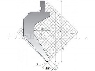 Пуансон гусевидного типа. Предназначен преимущественно для гибки деталей с длинными полками из различных вариантов толщин листового металла. Изготовлен из высококачественной легированной стали 42Cr (900 - 1150 Н/мм2). Рабочие поверхности закалены методом индукционной закалки до HRC 54 - 60 (1980 - 2200 Н/мм2). Все рабочие, крепёжные и стыковочные поверхности пуансона шлифованы.