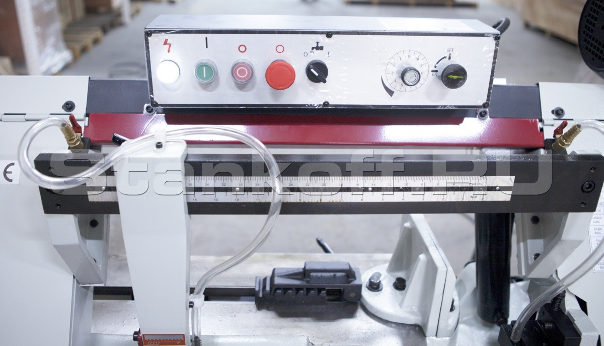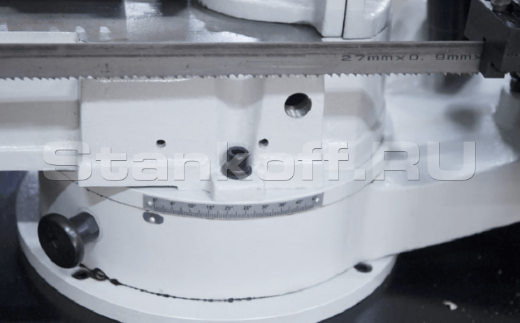 В рабочей зоне резания полотно точно ведется двумя направляющими головками. Станок имеет неподвижные тиски и поворотный механизм рамы, для пиления под углом необходимо изменить положение рамы относительно неподвижных тисков. Высота полотна 27мм позволяет пилить c высокой точностью и параллельностью полые и профильные заготовки под различными углами, в том числе и сплошные заготовки.