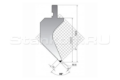 Пуансон гусевидного типа. Предназначен преимущественно для гибки деталей с большими и средними полками из различных вариантов толщин листового металла. Изготовлен из качественной конструкционной стали C45 (560 - 710 Н/мм2). Рабочие поверхности закалены методом индукционной закалки до HRC 54 - 60 (1980 - 2200 Н/мм2). Все рабочие, крепёжные и стыковочные поверхности пуансона шлифованы.