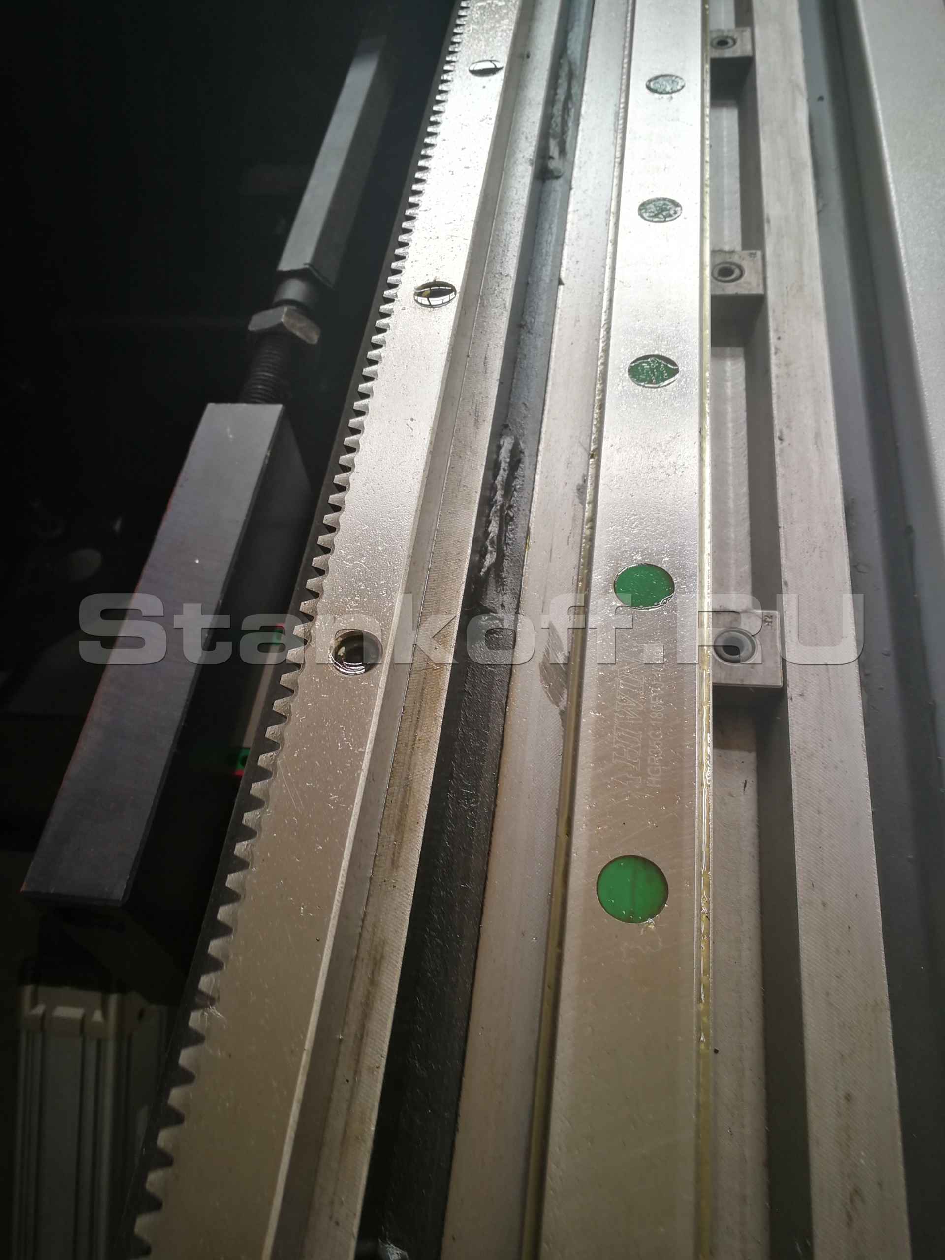 Перемещение лазерной головки осуществляется по линейным направляющим Hiwin (Тайвань) толщиной 35 мм. Направляющие производства Hiwin отвечают всем международным и европейским стандартам и производится с непрерывным контролем качества. Линейные направляющие Hiwin имеют следующие выдающиеся особенности: плавный ход, высокая точность и надежность, большая грузоподъемность, уплотненные каретки, низкое трение, низкий уровень шума, легкость установки.Редуктор Shimpo