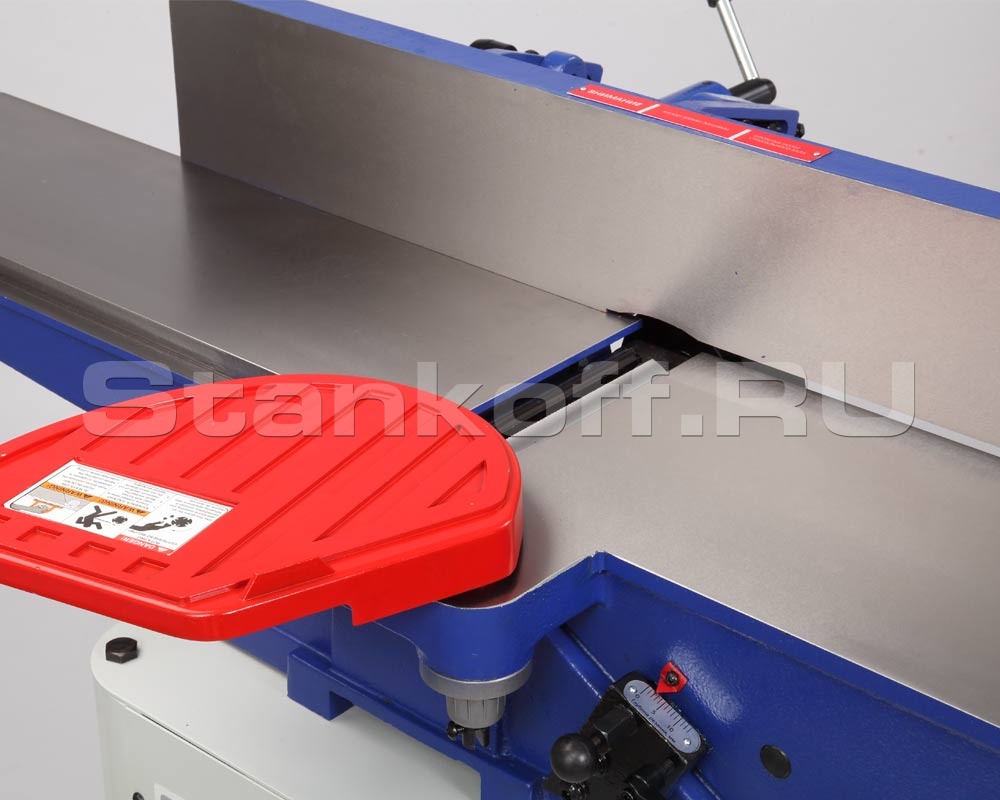 Максимальная ширина обрабатываемой заготовки составляет 152 мм. Строгальный вал оснащен тремя ножами. Рабочий стол и параллельный упор выполнены из чугуна. Для безопасной работы станок оборудован литым защитным кожухом ножевого вала. Также в комплекте есть специальные упоры для подачи заготовки. Параллельный упор позволяет осуществлять строгание под углом 90 и 45 градусов во внешнюю и внутреннюю стороны. Для отвода отходов обработки установлен аспирационный патрубок диаметром 103 мм, к которому можно подключить вытяжную установку. Устройство выполнено на стальной, сборной станине, оснащено подкатным приспособлением.