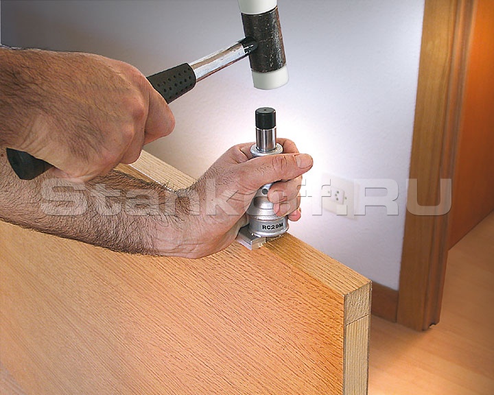 Устройство для выборки угла петли предназначено для формирования прямого угла после фрезерования посадочного места под карточные прямоугольные петли. Приспособление базируется по двум сторонам посадочного места петли таким образом, чтобы ножи оказались над радиусным участком, который остается после фрезерной обработки. При помощи RC29M можно вырубать участки с радиусом скругления до 20 мм при глубине до 6 мм.