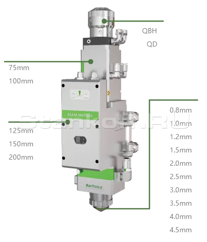 Направляющие и косозубые рейки станка закрыты гофрозащитными кожухами с металлическими накладками. Обычно используется только тканевая гофра, которая со временем прогорает и перестает выполнять грязезащитную функцию. Металлические накладки служат для предотвращения попадания окалины, искр, стружки на тканевую основу. Благодаря этому металлическому панцирю многократно увеличивается срок службы гофрированных кожухов.Режущая головка с автофокусом Raytools BM110