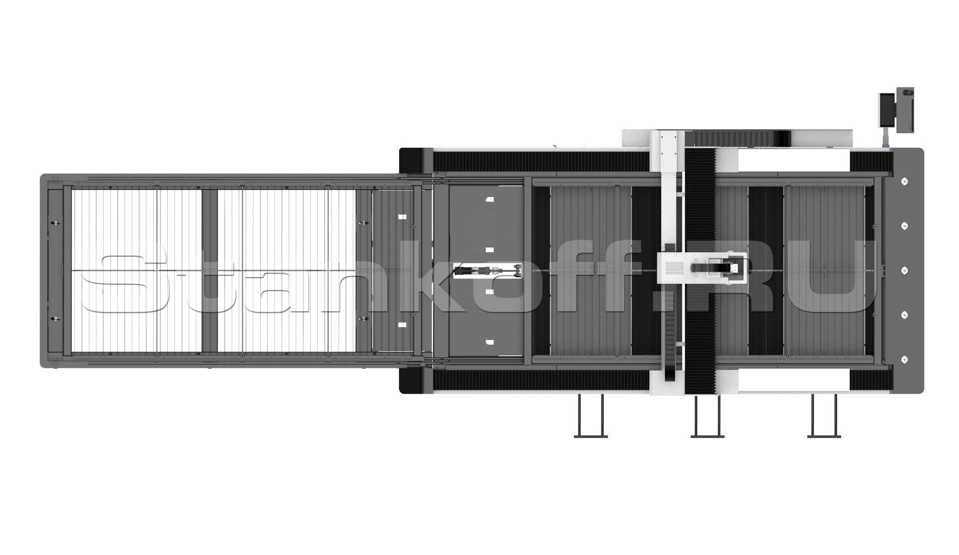 Направляющие и косозубые рейки станка закрыты гофрозащитными кожухами с металлическими накладками. Обычно используется только тканевая гофра, которая со временем прогорает и перестает выполнять грязезащитную функцию. Металлические накладки служат для предотвращения попадания окалины, искр, стружки на тканевую основу. Благодаря этому металлическому панцирю многократно увеличивается срок службы гофрированных кожухов.Отдельностоящий электрошкаф