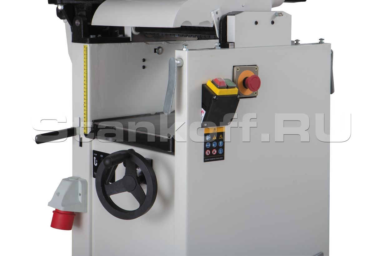 По основным характеристикам и удобству работы этот комбинированный станок не уступает отдельным рейсмусу и фуганку. Длинные и массивные чугунные столы создают базу, достаточную для работы с деталями длиной до 2-3 метров. Относительно специализированного станка несколько облегчен фуговальный упор: он не из чугуна, а из алюминиевого профиля. С другой стороны, эти модели обладают редким достоинством: удобную эксцентриковую регулировку по высоте имеет не только подающий, но и принимающий стол. Это необходимо, прежде всего, при замене строгального вала на helical, режущие пластины которого не регулируются по высоте.