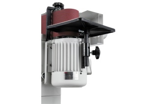 Модель оснащена вспомогательным механизмом, который за счет поворота узла переднего натяжного ролика обеспечивает колебания ленты в направлении перпендикулярном основному движению. Осцилляция способствует более эффективной работе абразива и повышает производительность станка. Ленточный узел станка выполнен поворотным вокруг продольной оси, его можно установить вертикально, горизонтально или под любым промежуточным углом, фиксация выбранного положения производится эксцентриковой рукояткой без использования инструмента. Основной рабочий стол, сделанный из литого чугуна, регулируется по высоте, что позволяет выровнять его поверхность с плоскостью ленты при её горизонтальном положении или использовать ресурс всей её ширины при эксплуатации в вертикальном. Для фиксации заготовки предусмотрены длинный «параллельный» упор с фиксацией в Т-образном пазу и подвижный угловой.