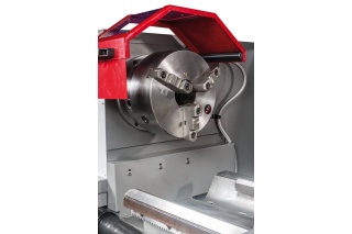 Передняя бабка станка комплектуется электромеханической муфтой, механизм плавного пуска защищает двигатель от пиковых стартовых нагрузок. Привод шпинделя данной модели постоянно находится в масляной ванне, что позволяет решить проблему его смазки, охлаждения и снизить уровень шума. Такой же подход применен и к шестерням передней бабки и коробки подач. На станке можно обрабатывать заготовки на скоростях от 9 до 1600 об/мин, режим 9 об/мин используется для нарезания резьбы плашкой. GH-2060ZH DRO RFS оснащен удобным управлением продольной и поперечной подачей посредством джойстика, предусмотрена возможность ускоренного перемещения суппорта. Для облегчения смены режимов работы предусмотрен толчковый (импульсный) пуск двигателя. Коробка подач станка имеет 80 предустановленных режимов, что позволяет с высокой точностью нарезать метрические, дюймовые, питчевые и модульные резьбы, при этом биение на шпинделе не превышает 9 микрон.