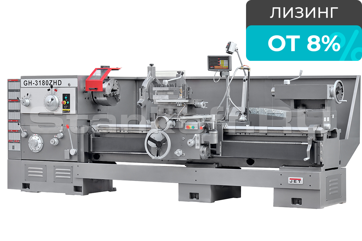 GH-3180 ZHD DRO - еще одна новинка линейки GH в продуктовом портфеле компании JET. Это токарно-винторезный станок индустриального класса, предназначенный для обработки массивных и длинномерных заготовок из различных сортов стали, сплавов или цветных металлов, который может работать в условиях длительных и тяжелых нагрузок. Станок изготавливается в строгом соответствии с протоколом DIN 8606, что обеспечивает соблюдение всех технологических допусков и норм, а также обеспечивает его обязательной гарантией в странах Таможенного союза ЕАЭС. Наилучшим местом применения станка станут металлообрабатывающие предприятия промежуточного и полного цикла, предприятия оборонной отрасли, крупные ремонтные мастерские. Как и у всех представителей данной серии, диаметр обработки над станиной равен 800 мм, со съемным мостиком - до 1000 мм (с ограничением до 310 мм по длине обработки). Главное отличие данной модели - расстояние между центрами, у GH-3180 ZHD DRO оно увеличено до 2000 мм. Для обеспечения стабильной и эффективной работы с заготовками увеличенного размера и массы станок оборудован асинхронным электродвигателем мощностью 11 кВт. Он способен обеспечить вращение шпинделя на скоростях от 7,5 до 1000 об/мин, необходимую скорость можно выбирать из заранее предустановленных диапазонов. Автоматическая коробка подач имеет 65 предустановленных режимов в обеих плоскостях, что позволяет нарезать все типы резьб. Для того, чтобы заказчик смог в кратчайшие сроки произвести установку, пусконаладку и ввод станка в эксплуатацию, вместе с GH-3180 ZHD DRO поставляется весь необходимый комплект опций, включая систему подачи СОЖ, ножной тормоз шпинделя, 3-х и 4-х кулачковые патроны, планшайбу, люнеты, лампу освещения рабочей зоны, механизм ускоренной подачи шпинделя, поддон для стружки, заднюю защитную стенку и др.