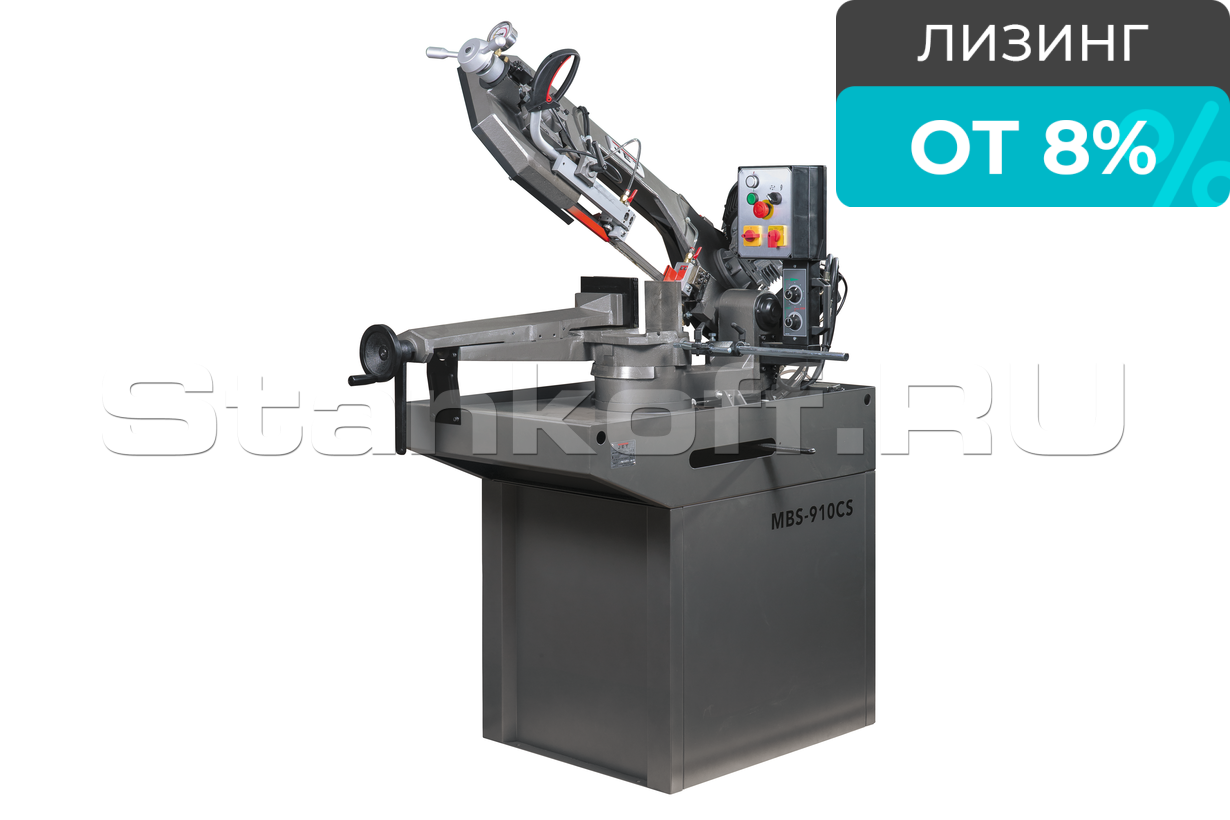 Ленточнопильный станок MBS-910CS представляет собой традиционную модель станков европейского типа, предназначенных для промышленного использования. Станок рассчитан на пиление круглых металлических заготовок под прямым углом максимально допустимого диаметра 225 мм. Особенности конструкции заключаются в возможностях поворота пильной рамы для обработки заготовок под разными углами. Угол поворота пильной рамы вправо составляет 60 0. Максимальный диаметр заготовки для распила под углом 45 0 составляет 160мм, при установке консоли под углом 60 0 – 90 мм. Станок MBS-910CS оборудован системой гидроразгрузки, с помощью которой осуществляется опускание консоли. Поднятие консоли обеспечивается оператором с помощью работы пружины–компенсатора. Наличие гидроцилиндра позволяет регулировать скорость подачи рамы в зону резания.
