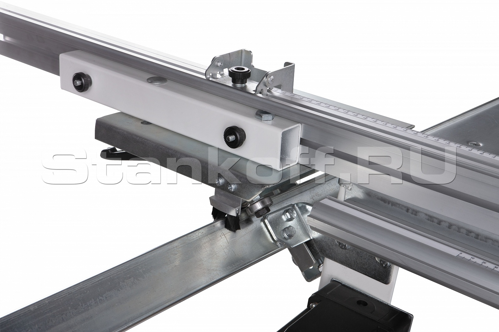 Параллельный упор перемещается вдоль направляющего профиля и имеет эксцентриковый зажим, обеспечивающий быструю и надежную фиксацию. Есть у JTS-315SP и подвижный стол, перемещающийся на роликах-подшипниках вдоль основного. Поверхность каретки невелика, но это отчасти компенсируется длинным упором заготовки, позволяющим добиться точности. Упор можно поворачивать, ориентируясь по транспортирной шкале; если нужна серия коротких изделий, настраивают концевой упор – он «ходит» вдоль основного. В отличие от большинства специализированных строительных пил JTS-315SP имеет регулировку наклона и глубины реза.