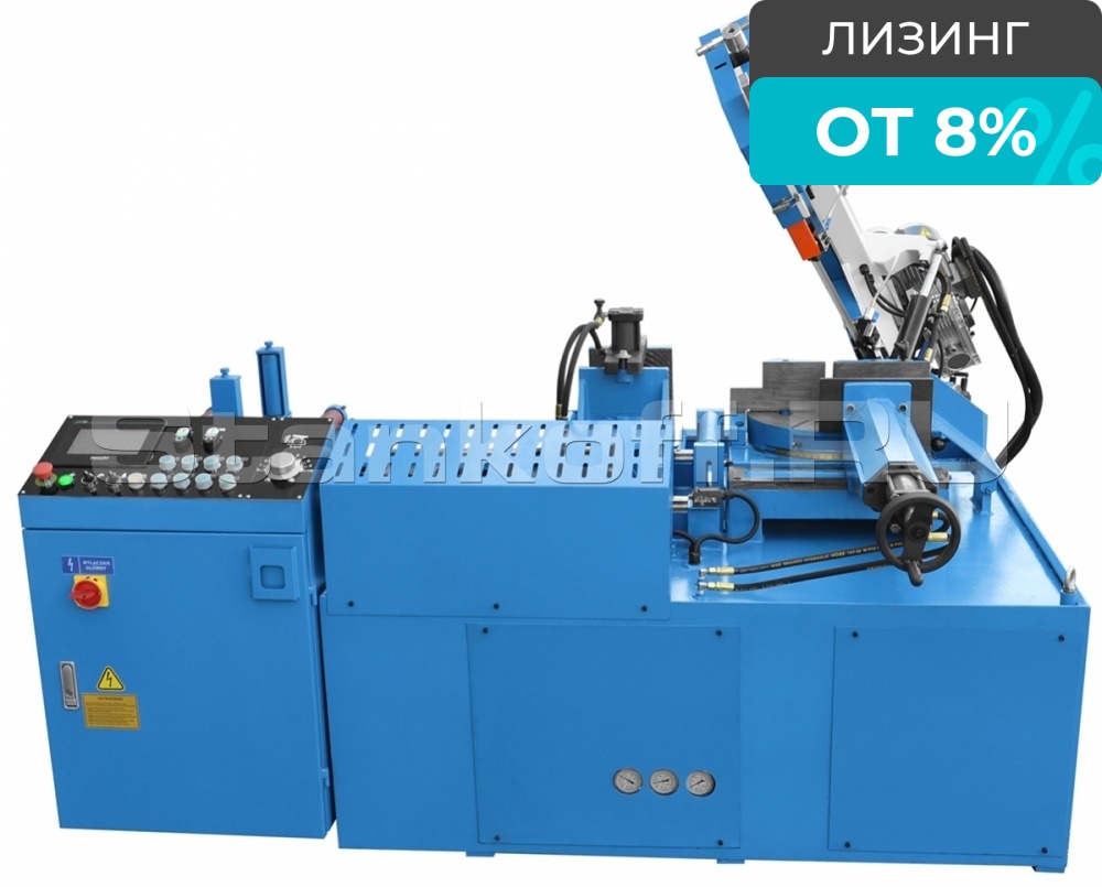 Консоль станка изготовлена из литого чугуна. Привод режущего полотна ы основан на двигателе, управляемым инвертором, что обеспечивает плавную регулировку в большом диапазоне скоростей. Гидравлическое натяжение полотна обеспечивает получение оптимальных условий работы ленты. В случае поломки полотна станок останавливается автоматически. Точное ведение полотна обеспечивают направляющие, состоящие из подшипников, направляющих и вкладышей из твердых сплавов. Максимальные параметры резки и длительный срок службы полотна обеспечивает система СОЖ и щетка для чистки.