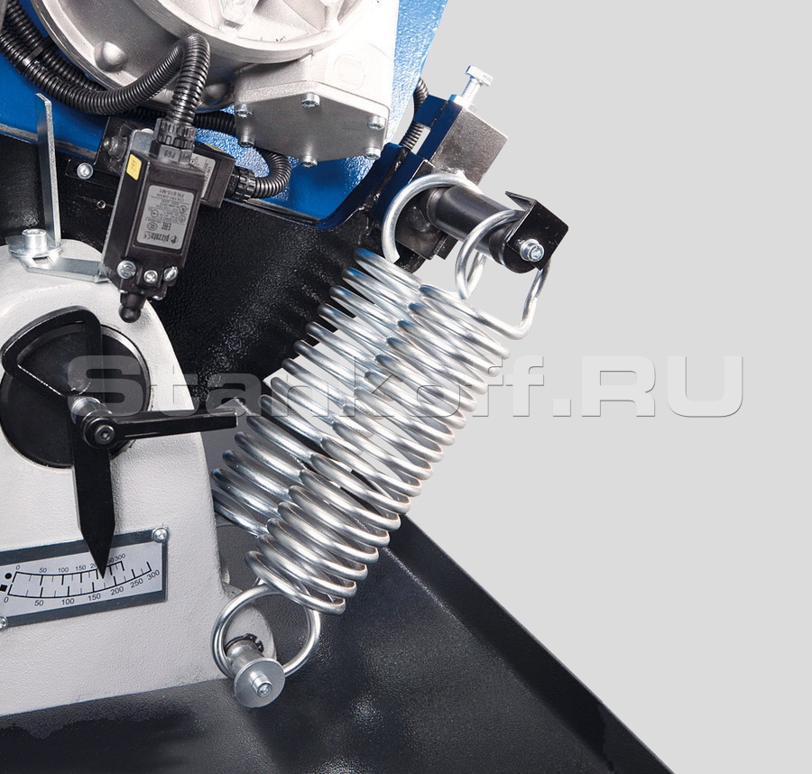 Универсальная конструкция зажимных тисков предусматривает возможность пиления заготовок под углом в диапазоне от -45⁰ до 60⁰. Габаритная тумба и массивный поворотный стол с увеличенной загрузочной поверхностью обеспечивают максимальную стабильность процесса резания, даже при пилении труднообрабатываемых материалов.