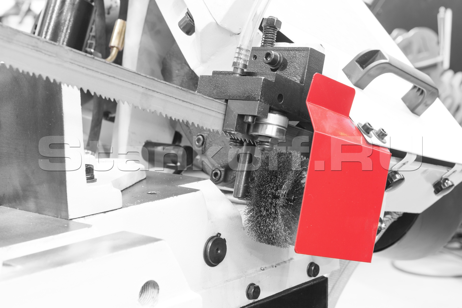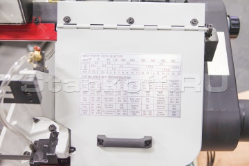 В рабочей зоне резания полотно точно ведется двумя направляющими головками. Станок имеет поворот губок тисков, для пиления под углом необходимо изменять угол установки тисков. Высота полотна 27мм позволяет пилить c высокой точностью и параллельностью полые и профильные заготовки под различными углами, в том числе и сплошные заготовки.