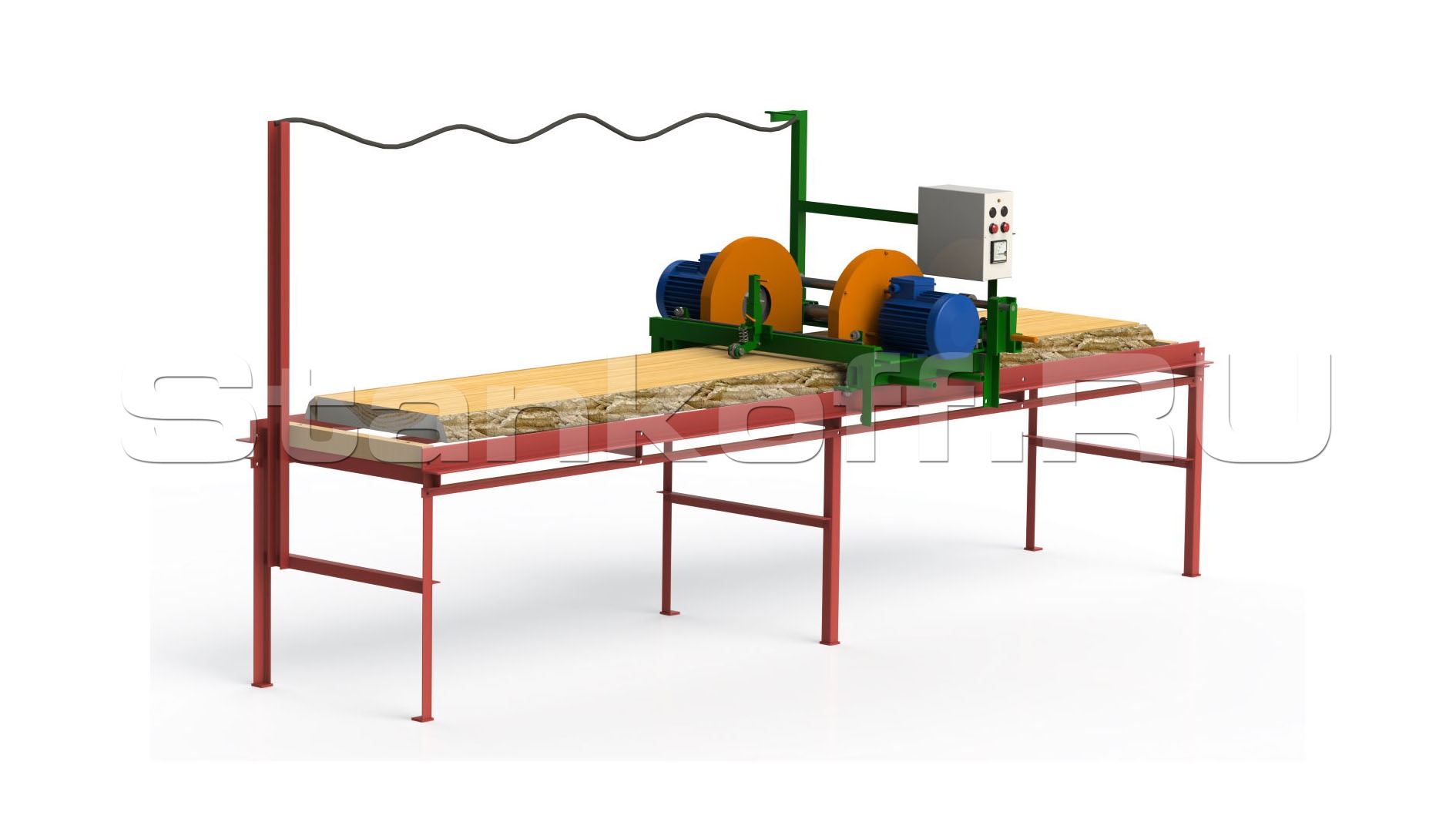 Доска укладывается по центру стола и обрезается сразу с двух сторон при движении пильной каретки как в прямом, так и в обратном направлении. Прижим доски обеспечивается прижимными роликами по центру доски. Дисковые пилы вращаются друг против друга, всегда в одном направлении, вт.ч. при смене направления пильного блока. Перемещение пильного блока осуществляется оператором станка вручную за поручни. Для удобства транспортировки рама (стол) станка разбирается на две направляющие секции (длиной 3,89 м каждая ) и пять стоек.