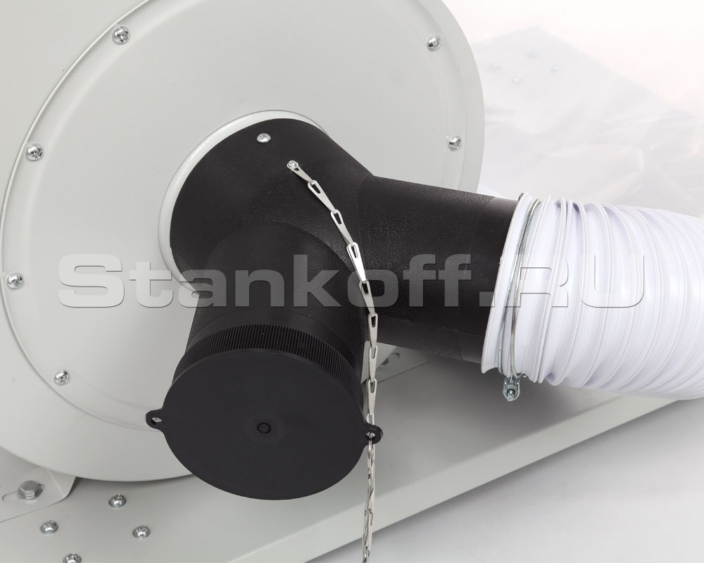 Установка вытяжная DC2500 — имеет традиционную конструкцию: на платформе-основании размещены корпус установки с асинхронным двигателем и стойки. К выходному патрубку крепится отводящий пластиковый армированный шланг диаметром 125 мм, по которому воздух попадает в разделительный корпус. На входной патрубок (Ø100 мм) устанавливается адаптер, посредством которого вытяжку можно подключить сразу к двум точкам удаления отходов резания, мощности для этого достаточно.Фильтр-мешок и стружкосборник находятся на одной вертикальной оси и крепятся к корпусу-разделителю с помощью двух зажимов. Мешок из плотного нетканого материала подвешивается на крючок опоры.