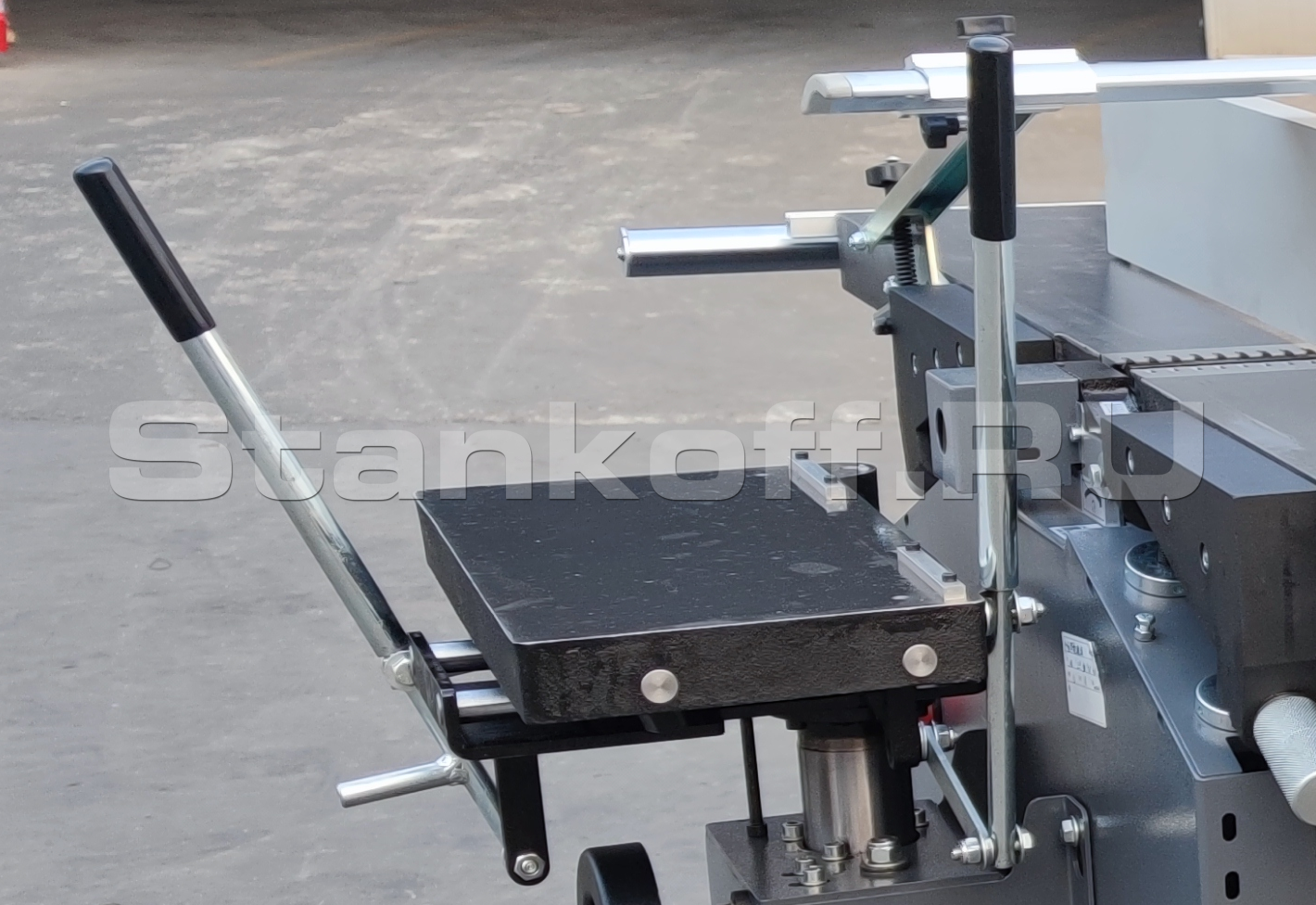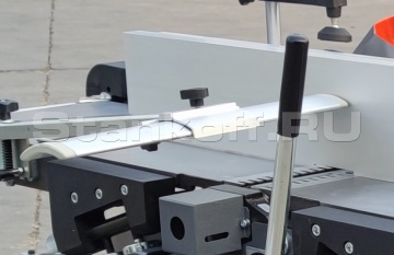 Фрезерный узел оснащен механизмом регулировки направляющих. Осуществляется с помощью рукояток и необходима для регулировки глубины фрезерования. Настраивается как подающая, так и принимающая линейка.Телескопическая линейка