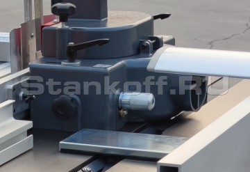 Регулировка угла наклона пильного блока осуществляется при помощи маховика на фронтальной части станка по градуированной шкале. Маховик имеет фиксатор, который после установки необходимого угла препятствует сбою установленных значений в процессе работы.Регулировка направляющих линеек фрезерного узла