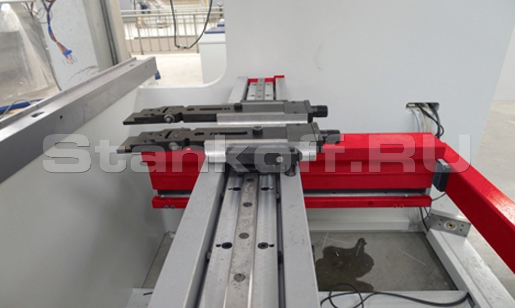 Электромеханический задний упор с автоматическим перемещением по оси X имеет ход 500мм. Премещение заднего упора осуществляется по линейным направляющим посредством высокоточной шарико-винтовой пары и сервомотора. Три откидывающихся упорных блока в ручную перемещаются по двум линейным направляющим вдоль балки заднего упора (оси Z), оснащены тремя упорными поверхностями и ручной регулировку по высоте (ось R). Каждый упорный блок оснащен лимбом для точной подстройки по оси X.Комплект секционных держателей