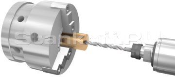 Задний инструментальный суппорт предназначен как для установки расточного инструмента, так и крепления вращающегося центра для фиксации при обработке длинных заготовок и используется как задняя бабка. В линейке есть модификация станка с полноценным противошпинделем.Крепление заготовки