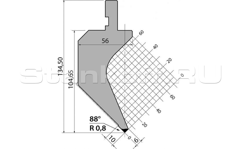 Пуансон гусевидного типа. Предназначен преимущественно для гибки деталей с большими и средними полками из различных вариантов толщин листового металла. Изготовлен из качественной конструкционной стали C45 (560 - 710 Н/мм2).