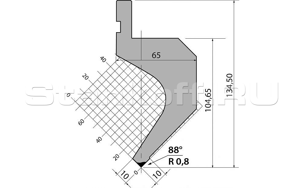 Пуансон гусевидного типа. Предназначен преимущественно для гибки деталей с большими и средними полками из различных вариантов толщин листового металла. Развёрнутый обратно пуансон. Изготовлен из качественной конструкционной стали C45 (560 - 710 Н/мм2).