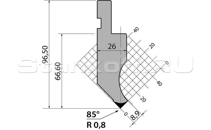 Пуансон прямого типа. Предназначен преимущественно для гибки деталей с маленькими и средними полками из различных вариантов толщин листового металла. Изготовлен из качественной конструкционной стали C45:560-710 N/mm².