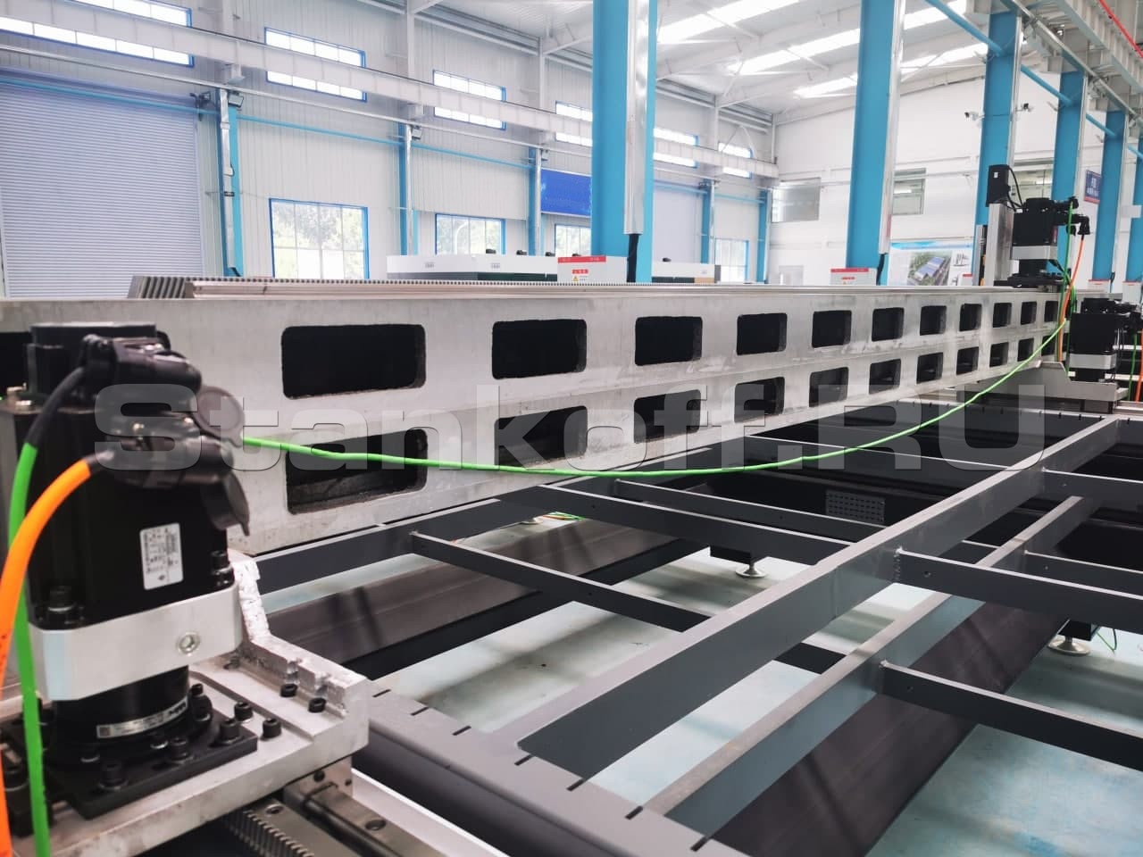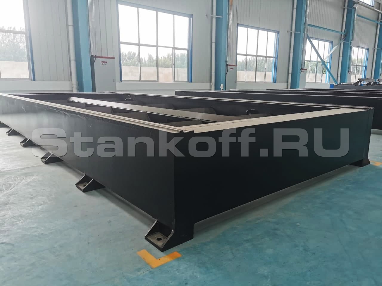Направляющие и косозубые рейки станка закрыты гофрозащитными кожухами с металлическими накладками. Обычно используется только тканевая гофра, которая со временем прогорает и перестает выполнять грязезащитную функцию. Металлические накладки служат для предотвращения попадания окалины, искр, стружки на тканевую основу. Благодаря этому металлическому панцирю многократно увеличивается срок службы гофрированных кожухов.Литой алюминиевый портал