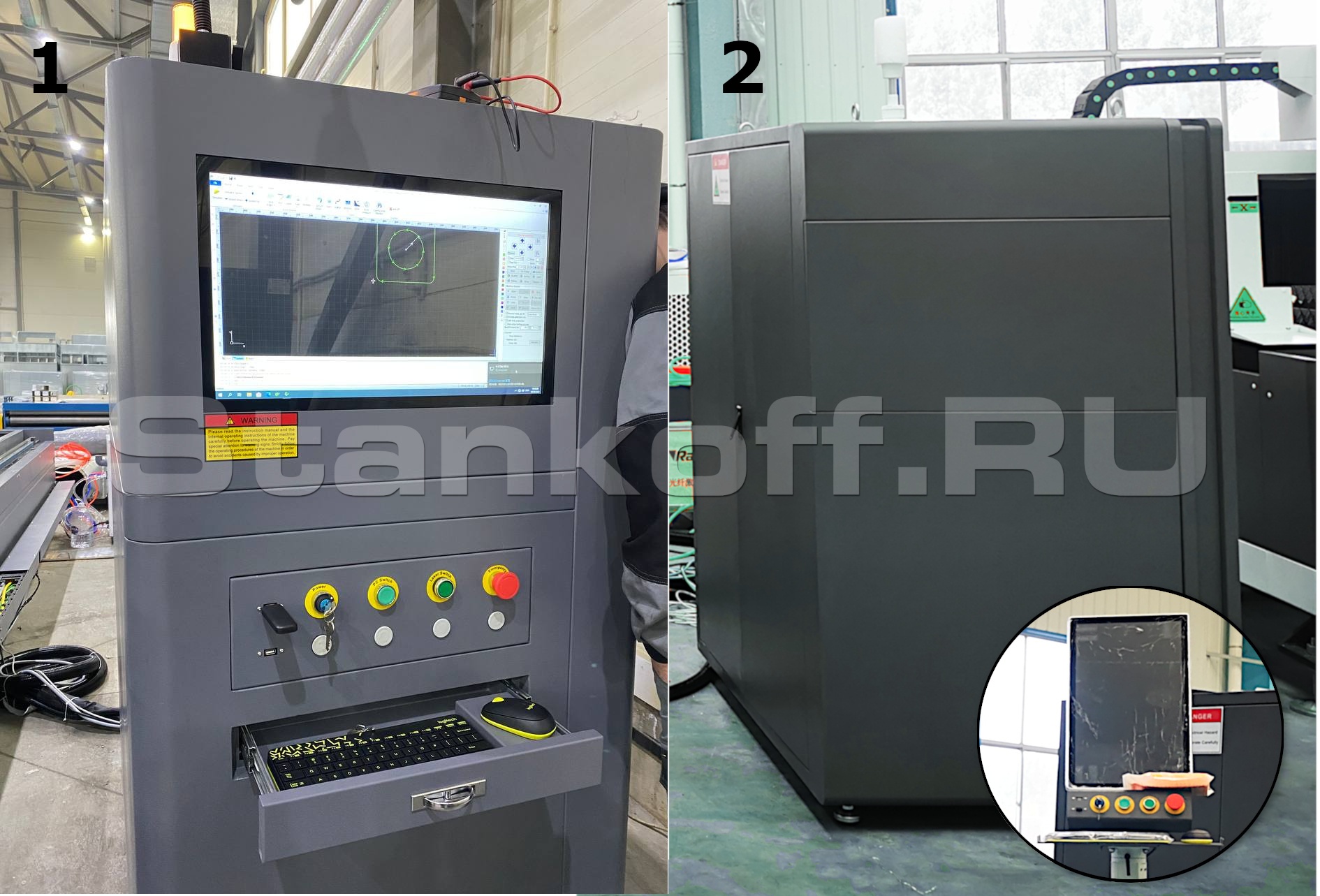 Вытяжной вентилятор используется для удаления газов горения. Для подключения вентилятора необходимо предусмотреть удаленное выключение. Если в помещении предусмотрена система очистки воздуха, можно подключить вентилятор к этой системе.Все электрические компоненты интегрированы в стойку управления ЧПУ. Из предустановленного П.О. происходит управление лазерным комплексом, а также калибровка необходимых узлов перед запуском в работу оборудования.