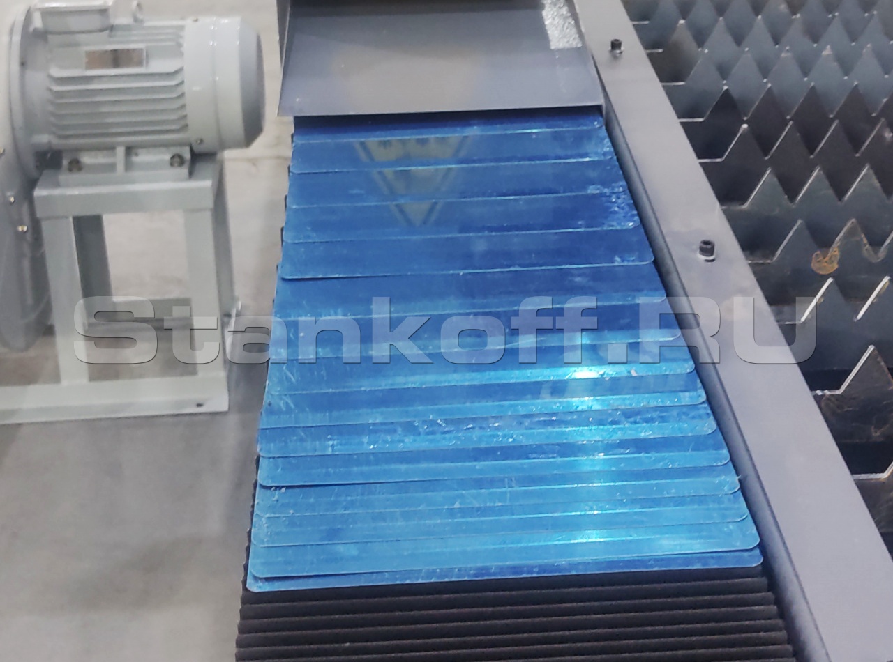 Стальной лист толщиной 10 мм препятствует попаданию искр на рабочие механизмы станка в процессе лазерной резки.Автоматизированная зональная система дымоудаления