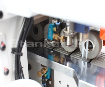 Оснащен пневматическими шторками защищающими клеенаносящий вал от грязи и пыли. Шторки автоматически открываются при подаче заготовки, обеспечивая лучшее качество приклеивания кромки.Зона прижима