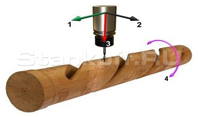 Ось вращения для обработки балясин. Максимальный диаметр заготовки - 300 мм. Длина заготовки максимальная - 1500 мм. Поставляется с трехкулачковым патроном и задней бабкой, перемещающейся по направляющим. Поддерживается полноценная четырех-осевая обработка.
