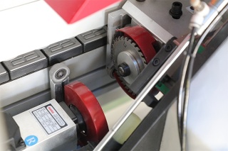 Оснащена главным прижимным роликом с приводом и тремя дожимными роликами позволяет прижать любую рулонную кромку и полосовой материал - рейку. С помощью цифрового счетчика регулируется ход прижима на толщину кромочного материала. Усилие пресс группы задается пневматически, что позволяет качественно приклеить кромочный материал к детали.Торцовочный узел