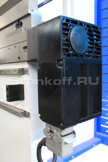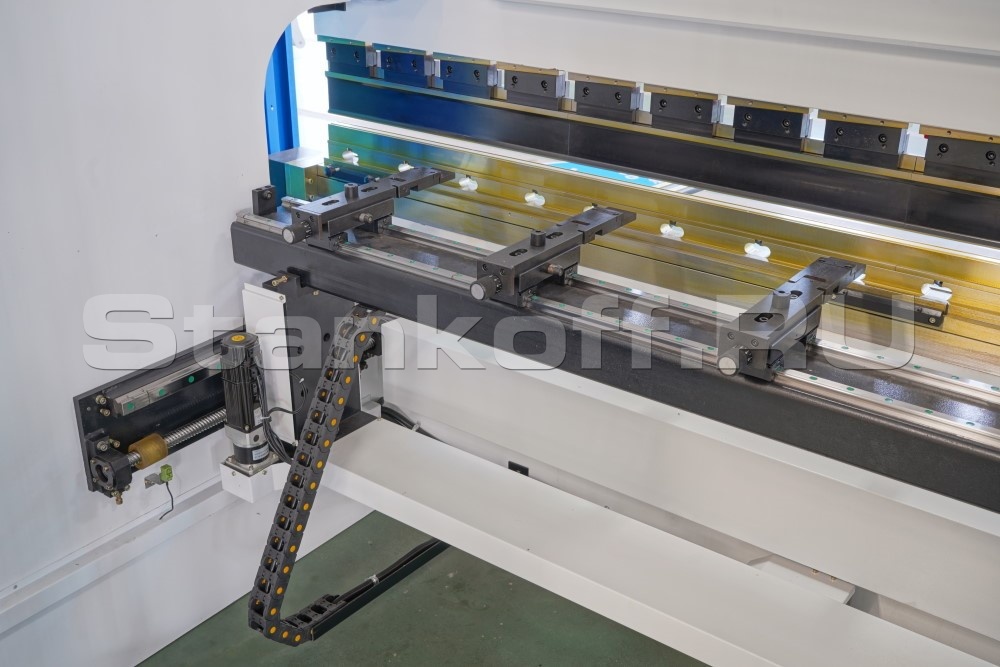 Управляемые ЧПУ оси: Y1, Y2 (перемещение траверсы) и X (задний упор). Перемещение траверсы обеспечено по направляющим с антифрикционным покрытием рабочих поверхностей. Траверса и гидравлические цилиндры пресса изготовлены из нормализованной стали, а их рабочие поверхности подвергнуты высокоточной механической обработке.