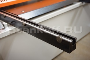 Перемещается задний упор по направляющим за счет ШВП (точность позиционирования 0,1 мм). При резки листа по ширине больше хода заднего упора, он уходит наверх автоматически как только в контроллер вносится соответствующее значение. Также при резке узких листов задний упор может совершать отходы/подходы для предотвращения скручивания и заклинивания.