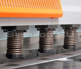 Программируемый, автоматический задний упор, ход - 1000 мм, точность позиционирования 0,1 мм. Если заготовка по длине больше 1000 мм, то упор автоматически поднимает наверх.Гидравлическая система по средствам ЧПУ регулирует зазор автоматически