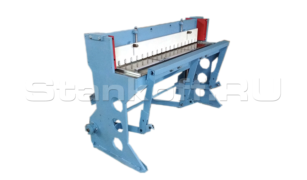 Ручная гильотина для рубки листа толщиной до 1,5 мм по г/к Ст.3, длина рабочий зоны 1300 мм. Шлифованные ножи твёрдостью 58HRC. До толщины металла 1 мм лёгкий рабочий ход. Кроме металла используется для рубки оргстекла, пластика, резины, картона и иных листовых материалов.