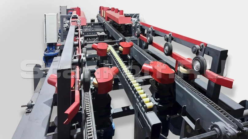 Высокопроизводительный углообрезной станок для обработки поддонов (паллет) применяется как в составе автоматической линии производства поддонов, так и автономно. Станок состоит из рамы, цепного транспортера подачи поддона, управляемого упора и четырех пильных суппортов. Размеры обрабатываемых поддонов: мин. 800*800 мм, макс. 1000*1200мм. Завод-изготовитель может изготовить оборудование для размера Вашего поддона.