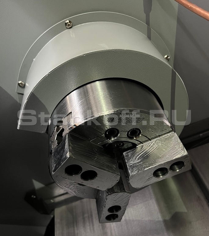 Станок укомплектован гидравлическим 3-х кулачковым патроном 8” (ø200) с проходным отверстием. Максимальный диаметр обрабатываемого прутка ø45мм. В комплекте с патроном идет комплект мягких и каленых кулачков.Револьверная голова Pragati