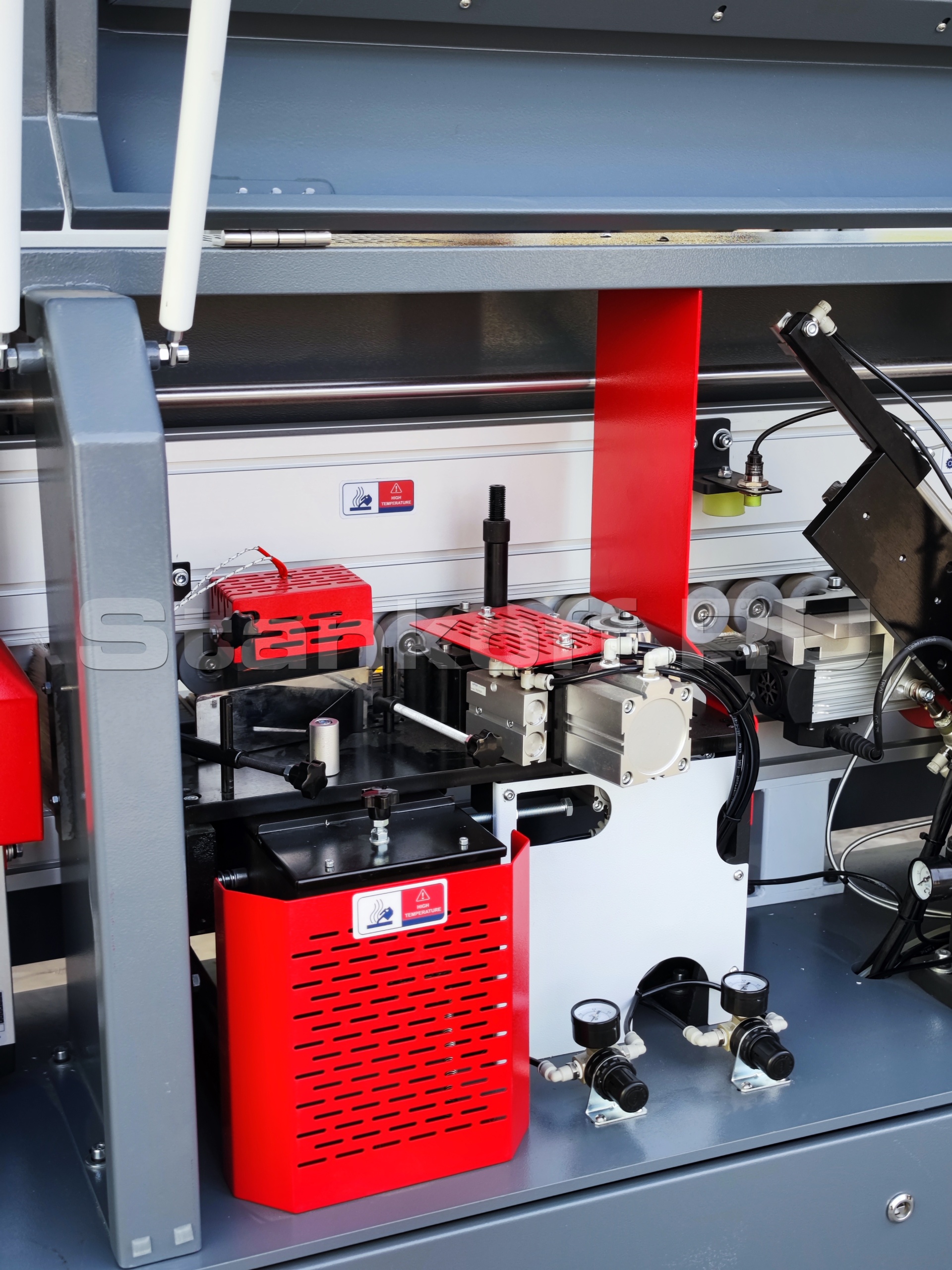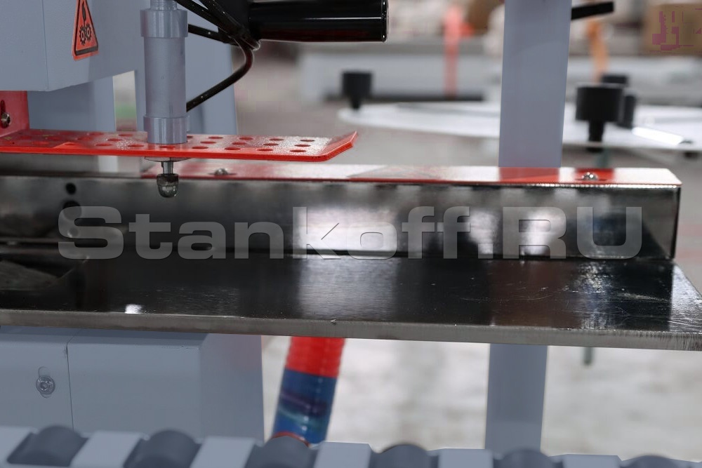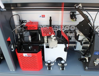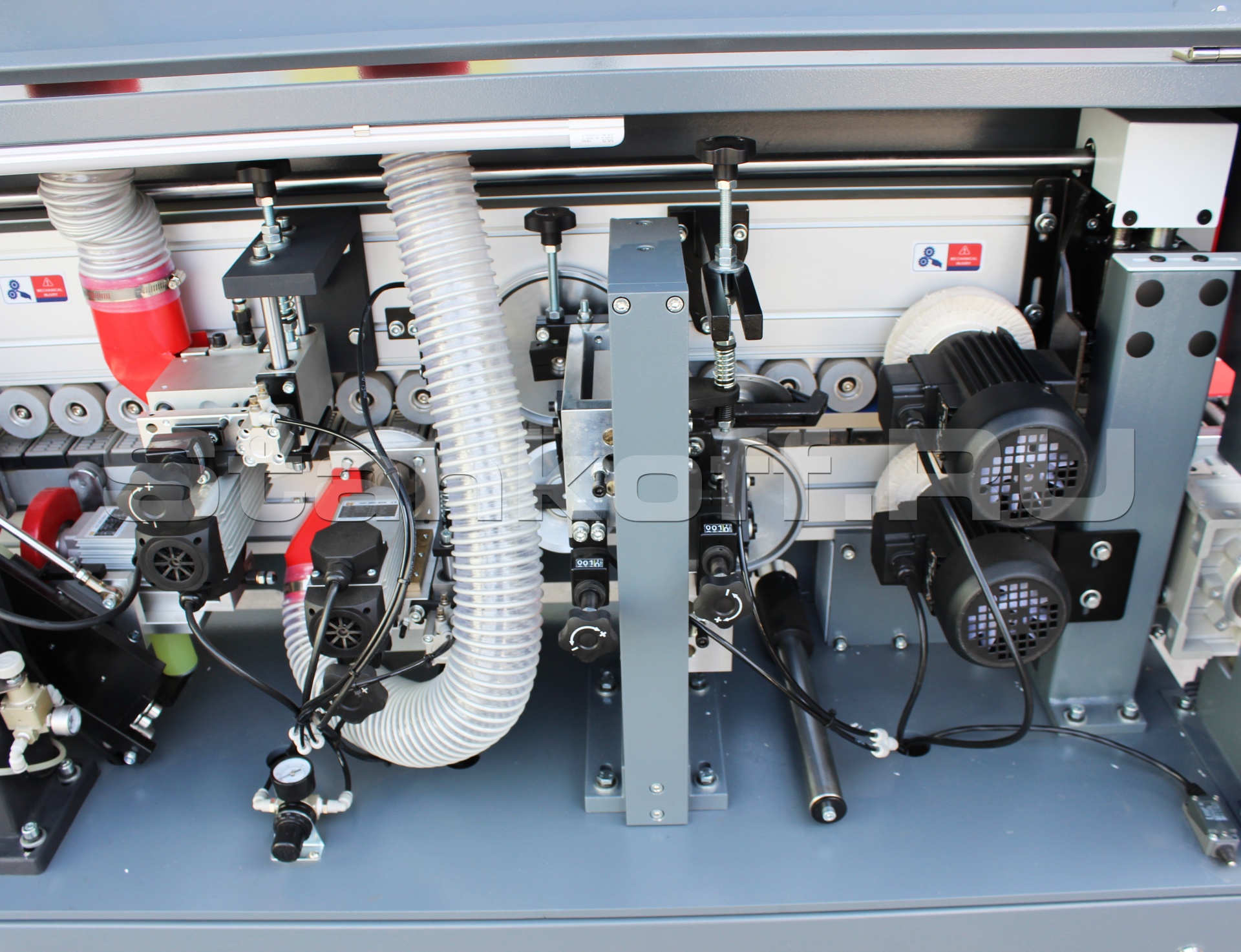 Промышленный клеевой узел и клеевая ванна большого объема. Точная регулировка наносимого клея, позволяет легко настроить станок под различные материалы, в том числе под ДСП различной плотности. Клеевой узел станка позволяет добиться качественного приклеивания, и настроить оптимальный клеевой шов, в зависимости от типа панелей.Торцовка
