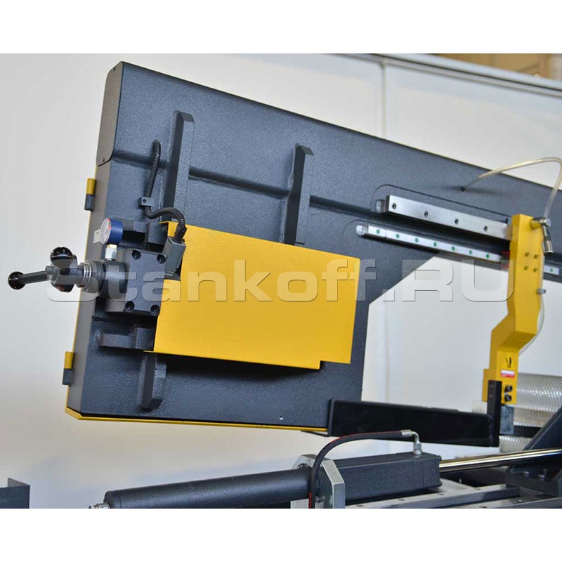 - Гидромеханическая система натяжения ленточнопильного полотна с манометром обеспечивает надежную фиксацию рекомендуемого значения натяжения.