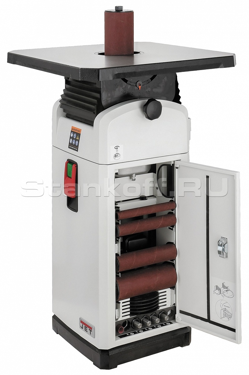 Стандартная комплектация включает в себя 10 шлифовальных шпинделей с диаметром от 6 до 100 миллиметров, а также кольцевые вставки в рабочий стол с круглым и овальным отверстием (для работы в наклонном положении стола). Расходный материал – абразивные гильзы – предлагаются со склада Jet в широком ассортименте.