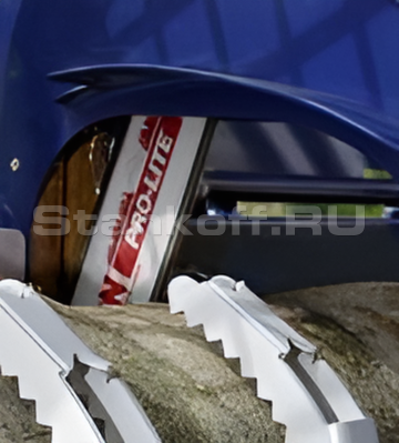 Зажим бревна происходит автоматически. Предотвращается его вращение, что обеспечивает правильное падение отпиливаемой части в емкость для раскола. Прижим бревна осуществляется гидравлически.Упор для ножа
