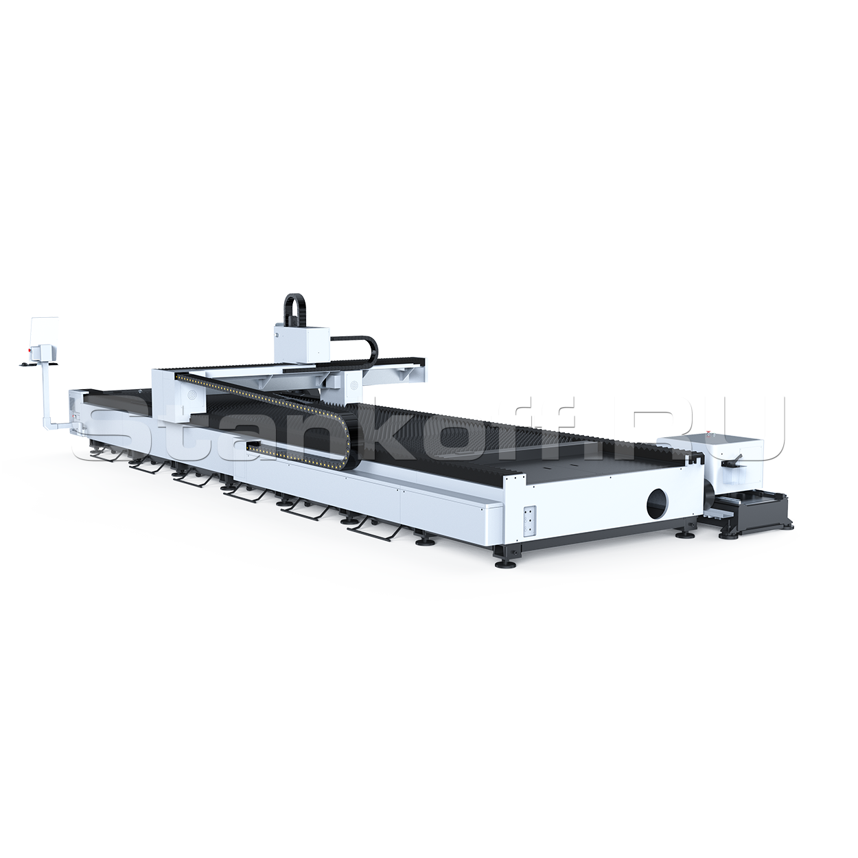 Станина сварена из высококачественной листовой стали и подвержена высокотемпературному отжигу. Все сварные швы выполняются исключительно в защитной атмосфере. Данная процедура обеспечивает долгий срок службы станка без механических деформаций.Литой алюминиевый портал