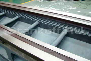 Мощная цельнолитая станина с широко разнесёнными направляющими и дополнительными ребрами жесткости отлита из чугуна. Такая конструкция станины обеспечивает повышенную жесткость, виброустойчивость и способна выдерживать большие нагрузки. Возможна обработка деталей массой до 8 т. (при зажатии в центрах и люнетах).Шпиндель
