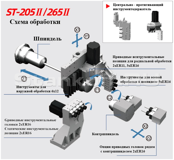 | Количество позиций инструмента для осевой обработки в контршпинделе | 2 приводных ER16; 2 статических ER16 |
