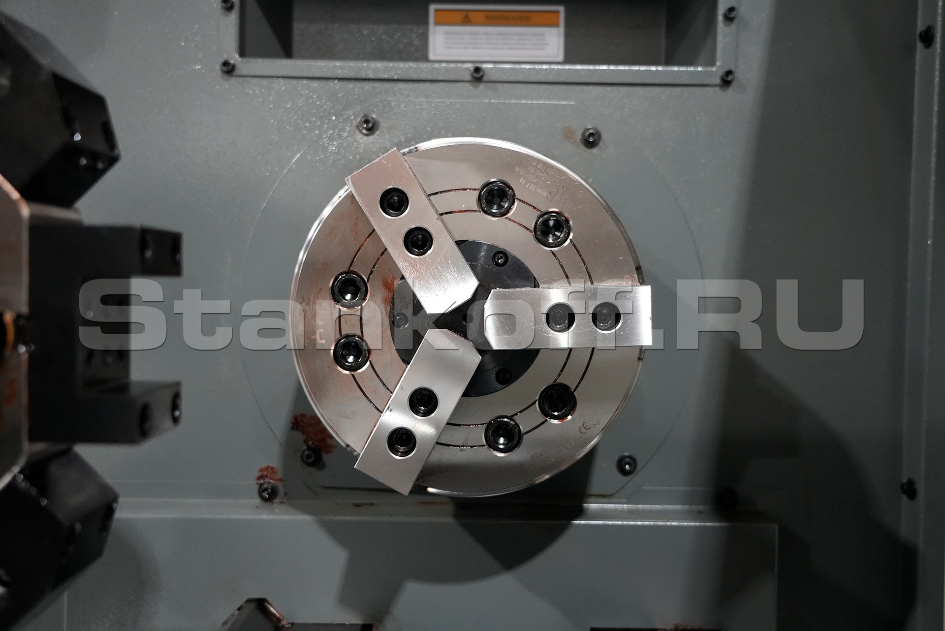 Шарико-винтовая передача является важнейшим элементом токарного центра с ЧПУ. С помощью ШВП осуществляется движение рабочего модуля станка – инструментального блока (резцедержка). Прецизионные шлифованные шарико-винтовые передачи обеспечивают высокую точность и повторяемость позиционирования инструмента (даже при высоких нагрузка при грубой обработке), плавное перемещение инструментального блока и его длительный срок службы.3-х кулачковый зажимной матрон (Гидравлический зажим)
