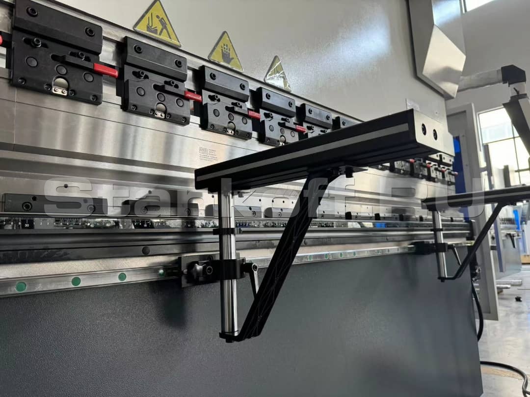 Предотвращает контакт гибочного инструмента с руками оператора при работе на высоких скоростях гибки. Если рука оператора оказывается в зоне гиба, то система немедленно реагирует и останавливает движение пуансона вниз, обеспечивая безопасность оператора.Дополнительный задний упор