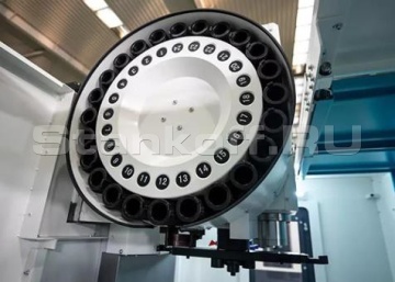 Станок оснащается высокоскоростным сменщиком инструмента с рукой-манипулятором на 24 позиции, который крепится на колонну. Смена инструмента происходит синхронно - рука-манипулятор меняет текущий инструмент в шпинделе и инструмент в магазине местами, за счет чего сокращается вспомогательное время обработки детали.ШВП с преднатягом класса точности С3